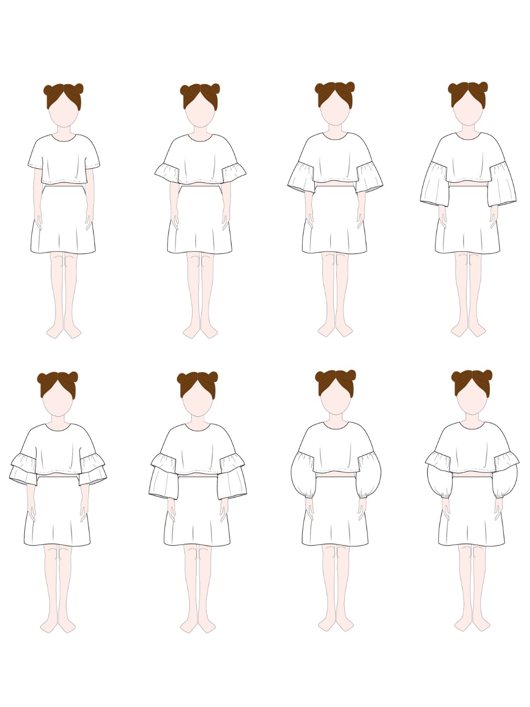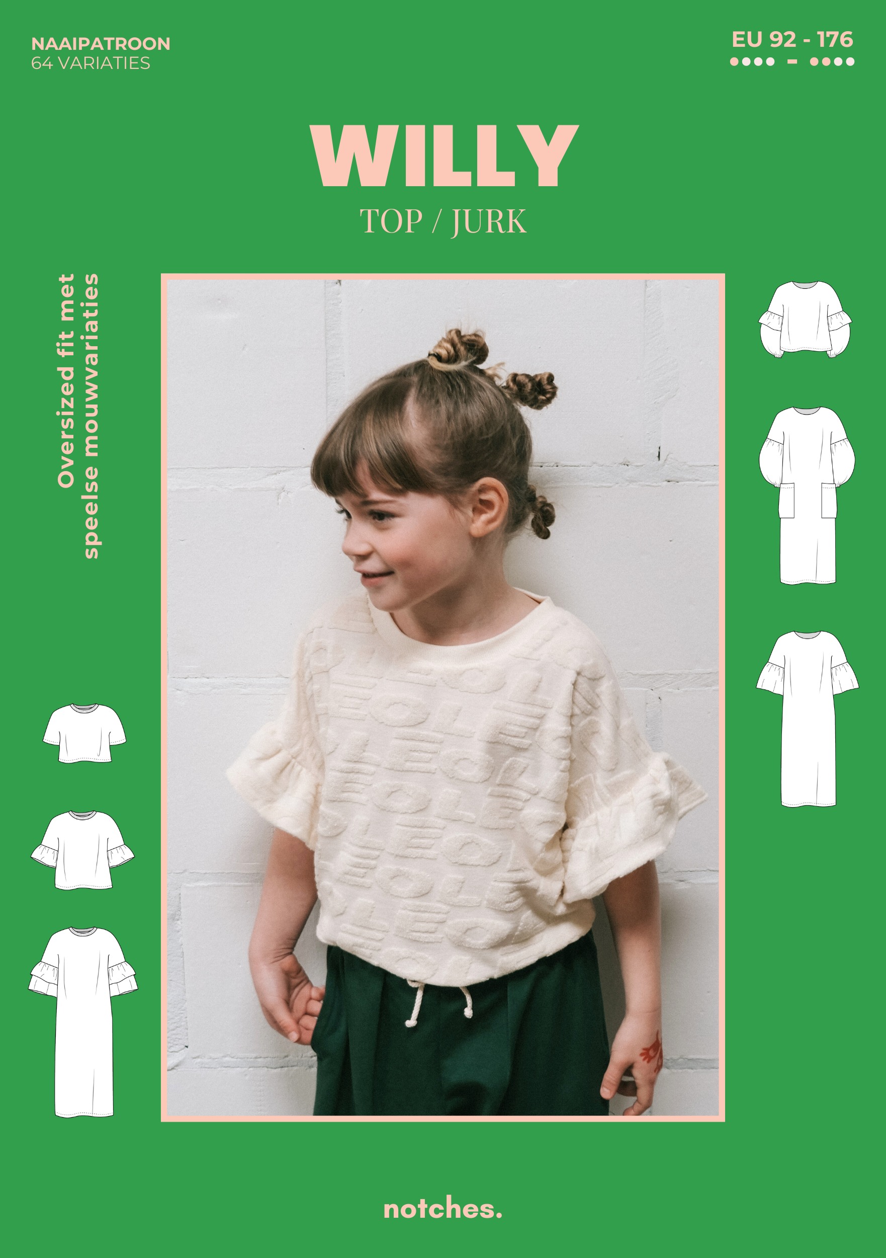 De magie zit in de veelzijdigheid. Kies tussen geweven of gebreide stoffen en creëer een knusse, casual look of een meer verfijnde, geklede outfit. Met opties zoals ruffles en ballonmouwen, verschillende lengtes (van cropped top tot lange jurk), verschillende halsafwerkingen en zelfs zakken, past het ontwerp zich volledig aan jouw persoonlijke wensen aan. Willy biedt eindeloze mogelijkheden met 64 variaties om uit te kiezen. De meest basic variant is een losse T-shirt die perfect is voor zowel jongens als meisjes én supersnel klaar!